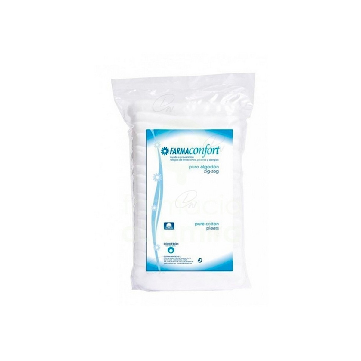 Algodón totalmente puro para múltiples usos, formato en zig-zag de Farmaconfort, es muy suave y esponjoso, está blanqueado sin cloro ni dioxin.