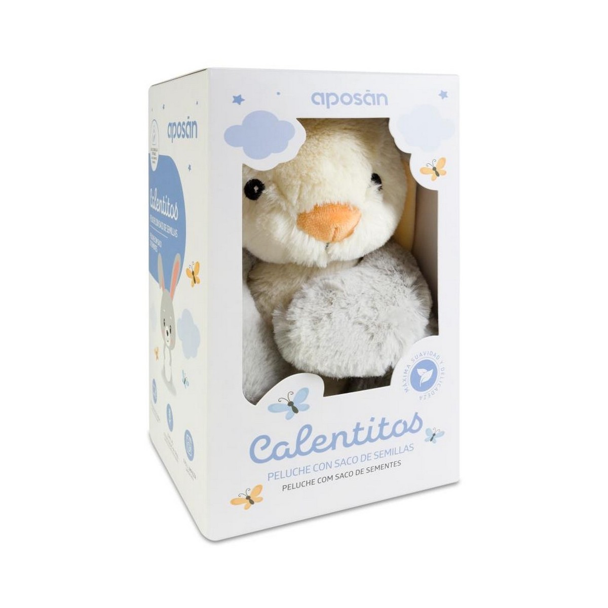 Peluche con saco de semillas de utilización en caliente. Las semillas permiten un elevado número de calentamientos, siempre que se respete el modo de empleo.