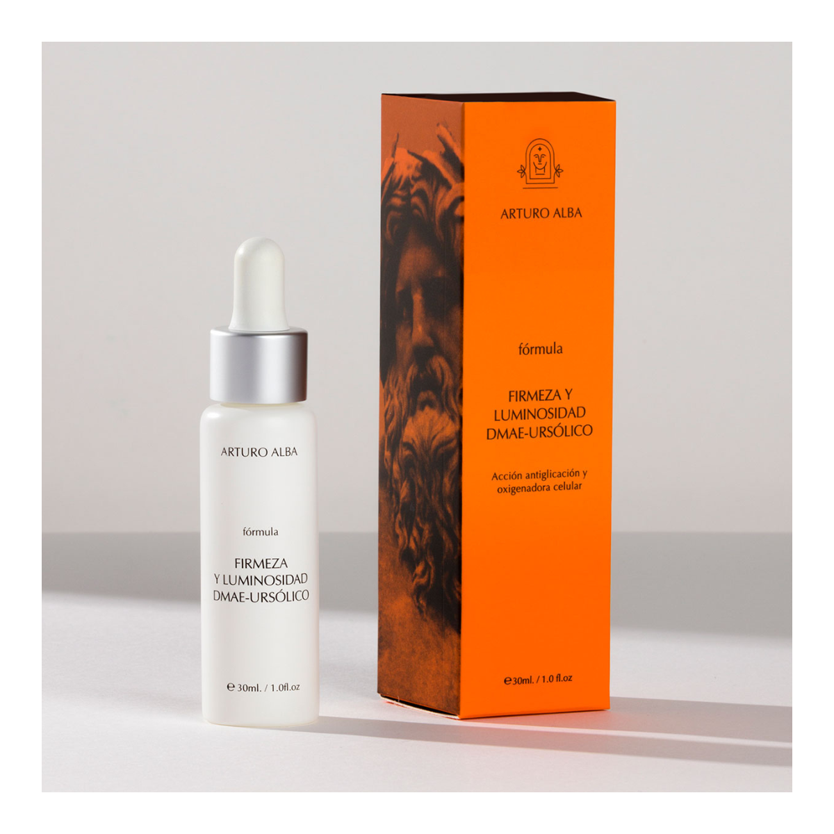 Sérum ultrafuido compuesto por una mezcla de potentes activos reafr- mantes, iluminadores e inductores de la elasticidad como el DMAE y el ácido ursólico que actúan en sinergia junto a los activos potenciadores de la oxigenación celular y la síntesis de colágeno como las sales orgánicas de cobre, magnesio, zinc, calcio y silicio.