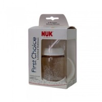 Limpieza de biberones, tetinas y accesorios: Antes de usarla por primera vez, colóquela en agua hirviendo durante 5 minutos, utilice suficiente agua para evitar dañar la tetina. Para garantizar la higiene, límpiela bien con un líquido limpiador suave y esterilícela antes de volver a usarla. Recomendamos el NUK Vapo Rapid para la esterilización. Para hervir el biberón o para esterilizarlo por vapor (temperatura superior a 80 °C), desmonte siempre todas las piezas y déjelo abierto, ya que de lo contrario se puede deformar. Algunos nutrientes de determinadas bebidas (por ejemplo el zumo de zanahorias) puede cambiar el color del material o su olor (por ejemplo la infusión de hinojo). Esto no produce ningún deterioro del biberón, y no afecta a su aptitud para el uso ni a su seguridad. Las tetinas y los biberones no son aptos para el lavavajillas - los detergentes podrían dañar el material. Esterilizar en el microondas, usando el Esterilizador Microondas NUK para evitar daños en el material.