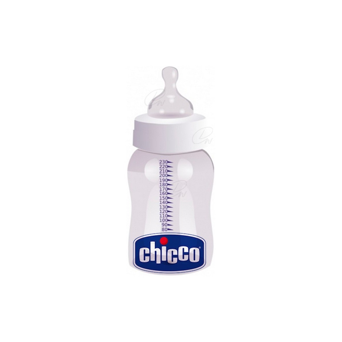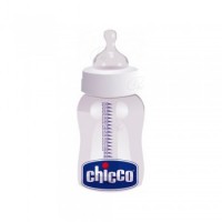 Biberón de boca ancha realizado en policarbonato con botella angular (30º) que permite mantener al bebé en posición correcta evitando la entrada de aire en la tetina. Tetina con forma ancha similar al pecho materno que garantiza un apoyo ideal de los labios del bebé. La tetina tiene unos anillos en relieve que aumentan la elasticidad y simulan una extensión natural del pezón materno. La válvula anticólico regula la entrada de aire compensando la salida de leche y garantizando un flujo regular; el orificio de salida permite un flujo medio (""flujo normal"") del contenido. La boca ancha permite rellenar fácilmente el biberón y facilita la limpieza. El vaso salvagota permite transportar el biberón sin pérdidas de líquido.