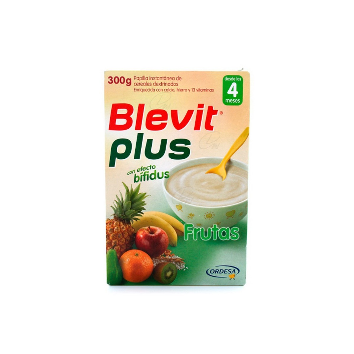 Harinas de cereales dextrinados 89,5% (arroz, maíz), pulpas de frutas 25% (naranja, manzana, plátano, piña, pera, kiwi), fructooligosacáridos 3%, sales minerales (calcio, hierro), aromas, dextrinomaltosa, complejo vitamínico (vitaminas C, Nicotinamida, E, pantotenato cálcico, B6, B2, B1, A, ácido fólico, K, biotina, D, B12).
