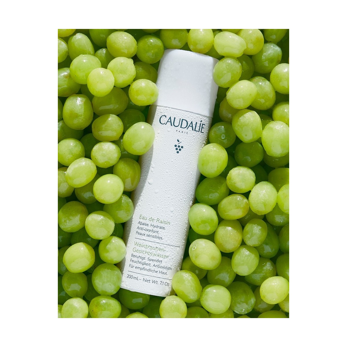 100% de Agua de uva bio. Sin alcohol. Sin perfume. Probada dermatológicamente.