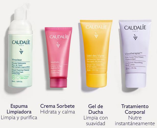 Esta NUEVA edición limitada contiene 4 tratamientos emblemáticos para Rostro y Cuerpo en formato de viaje: una Espuma Limpiadora Fleur de Vigne Vinoclean 50ml, una Crema Sorbete Hidratante Vinosource-Hydra 15ml, un Gel de Ducha Soleil des Vignes 30ml y un Tratamiento Corporal Nutritivo Hialurónico Vinotherapist™ 30ml.