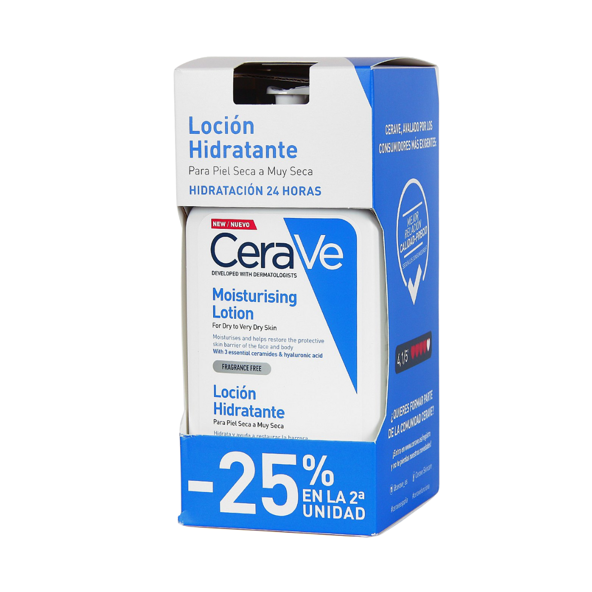 Su fórmula ligera y no grasa, desarrollada por dermatólogos, incluye ácido hialurónico, 3 ceramidas esenciales y glicerina. Esta combinación junto a la tecnología MVE®, consiguen una hidratación durante 24 horas. La fórmula de la loción de Cerave no contiene perfumes, por lo que es apta para pieles sensibles de adultos y niños.