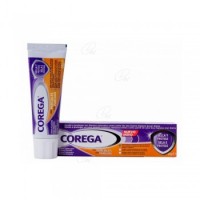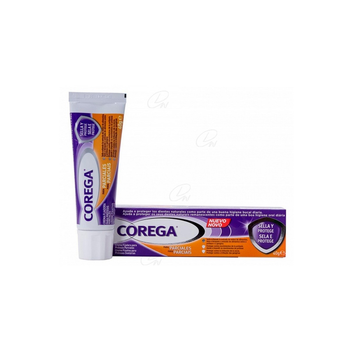 - Aplique Corega en tiras cortas sobre la prótesis parcial limpia y seca.
