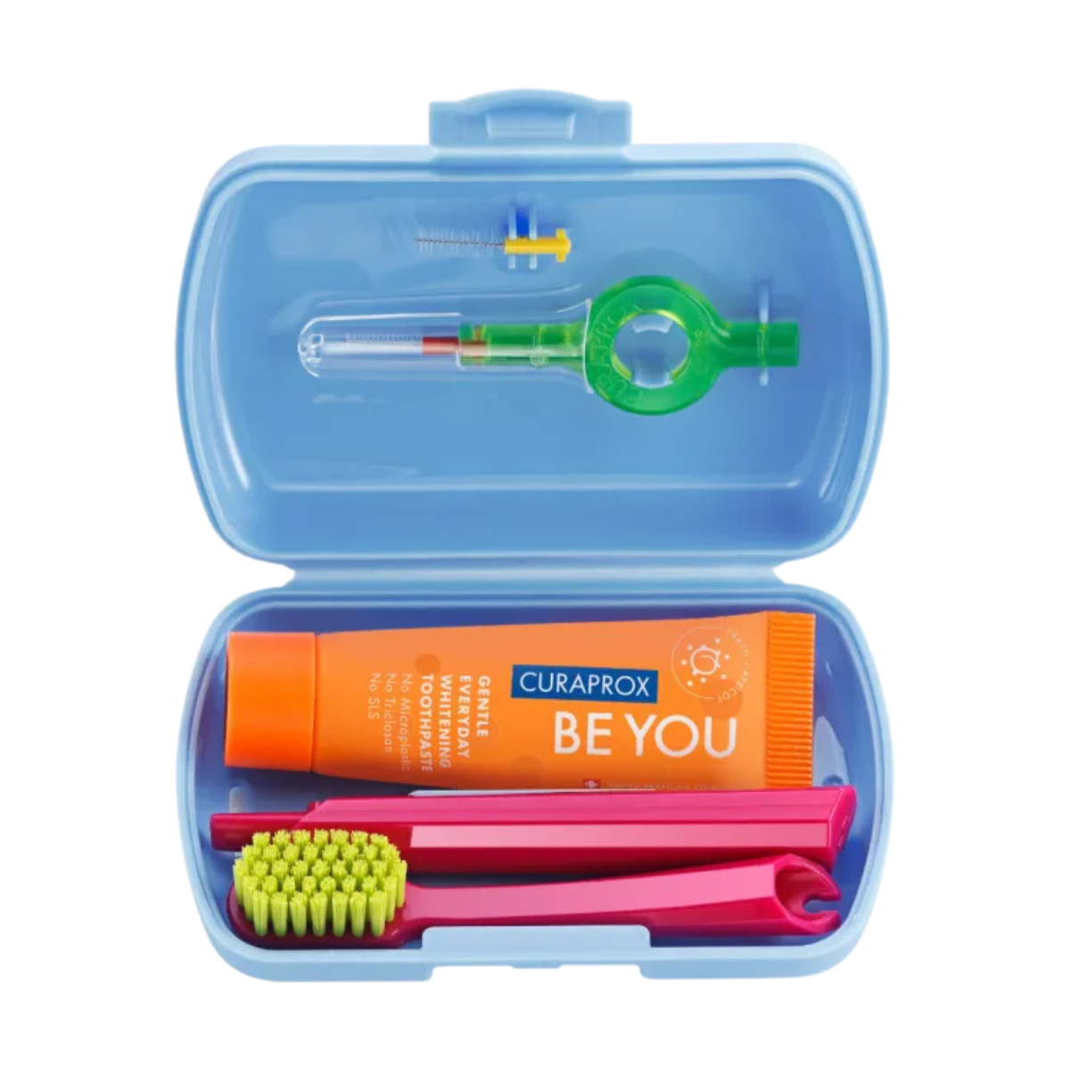 Tus productos Curaprox favoritos en tu maleta, tu equipaje de mano o en tu bolsillo. Este kit de viaje vibrante y elegante mide solo 9,5 cm x 6 cm.