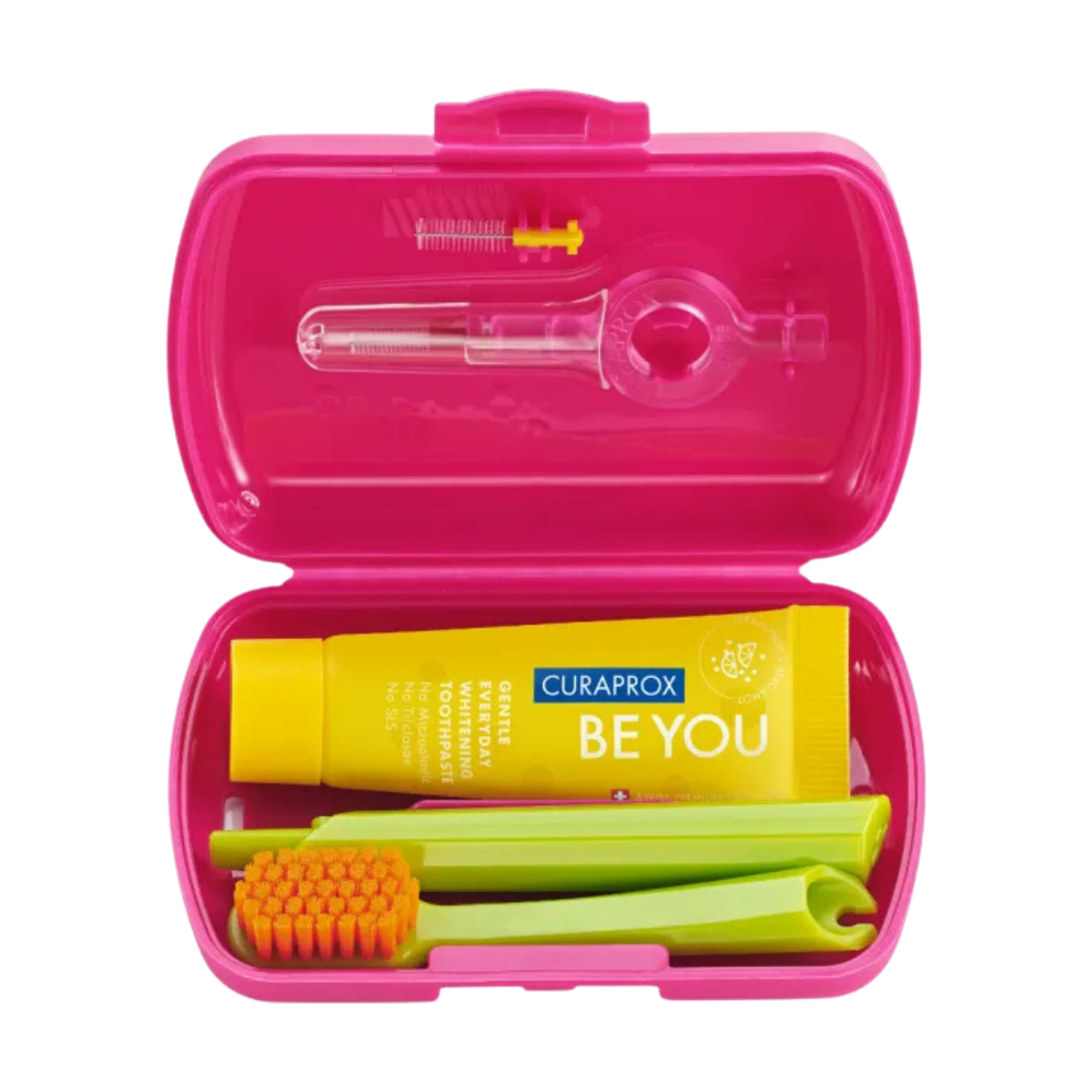 Tus productos Curaprox favoritos en tu maleta, tu equipaje de mano o en tu bolsillo. Este kit de viaje vibrante y elegante mide solo 9,5 cm x 6 cm.