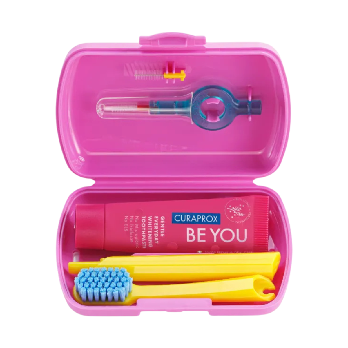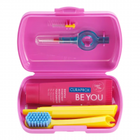 Tus productos Curaprox favoritos en tu maleta, tu equipaje de mano o en tu bolsillo. Este kit de viaje vibrante y elegante mide solo 9,5 cm x 6 cm.
