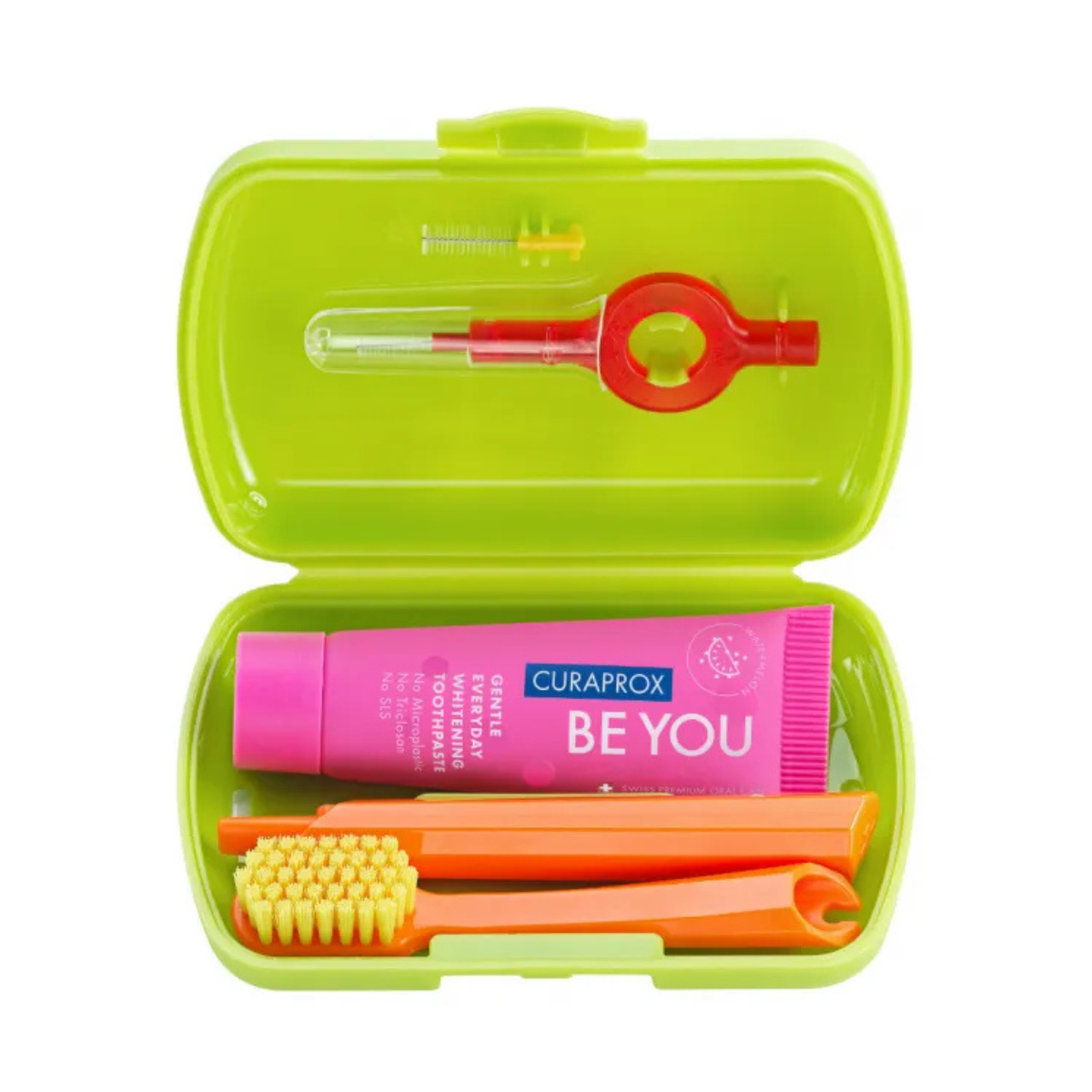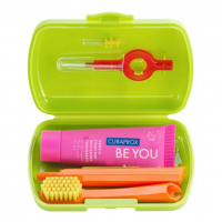Tus productos Curaprox favoritos en tu maleta, tu equipaje de mano o en tu bolsillo. Este kit de viaje vibrante y elegante mide solo 9,5 cm x 6 cm.