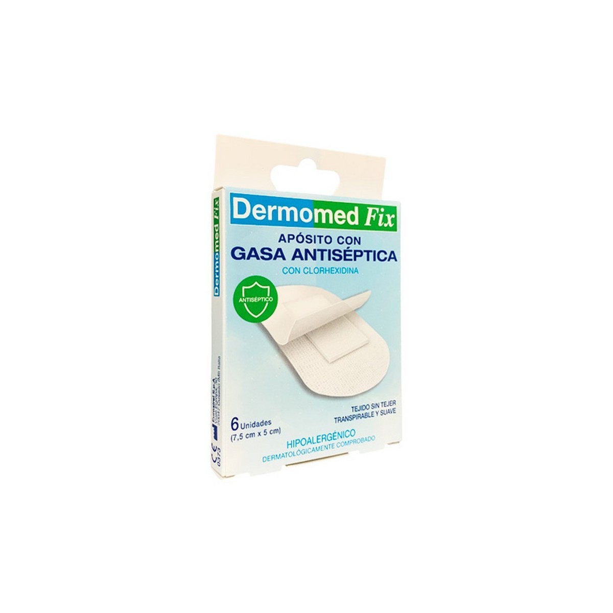 Dermomed Fix apósito con Gasa Antiséptica con clorhexidina es una apósito estéril, de un solo uso, que está indicado para la protección de heridas postoperatorias, cortes, abrasiones y quemaduras de primer grado.