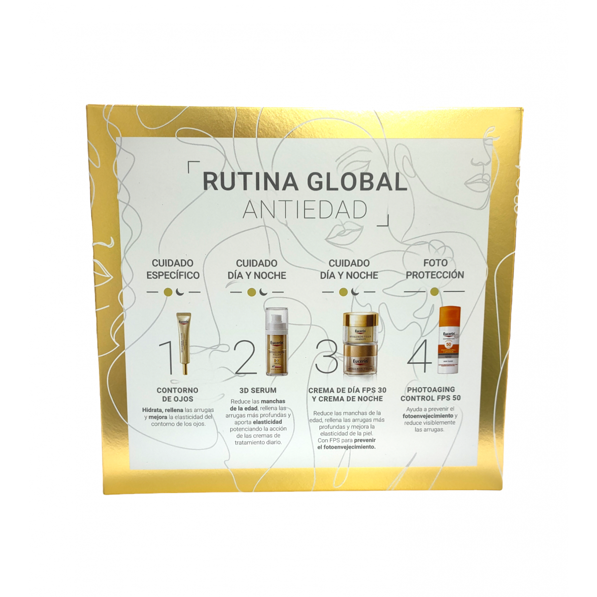 Su fórmula exclusiva ofrece múltiples beneficios antiedad. La combinación innovadora de Eucerin de Ácido Hialurónico de alto y bajo peso molecular rellena de manera visible las arrugas profundas. El nuevo Collagen-Elastin Complex, una potente combinación de Arctiina y Creatina, revitaliza la producción de colágeno y aumenta la elasticidad de la piel. Thiamidol, patentado por Eucerin, reduce las manchas de la edad y evita su reaparición. Para una piel más lisa, radiante y visiblemente más joven.