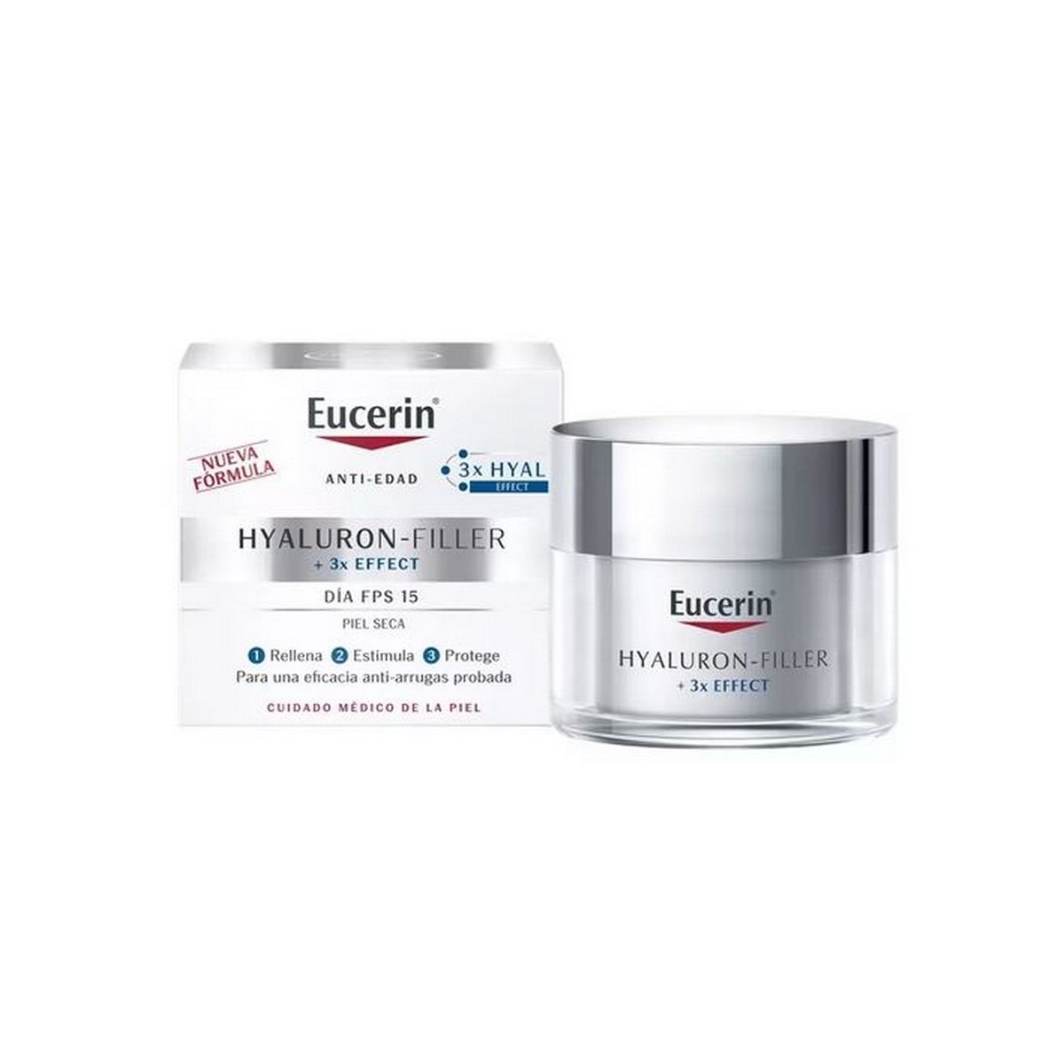 Eucerin Hyaluron-Filler Día FPS 15 para piel seca con nueva fórmula Triple Efecto (x3) contrarresta este proceso: