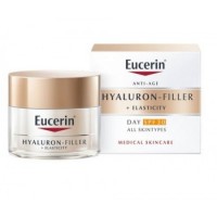 Eucerin Hyaluron-Filler + Elasticity Día FPS 30 es una crema de día antiedad que rellena las arrugas profundas, mejora la elasticidad de la piel y reduce las manchas de la edad.