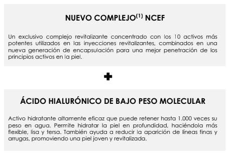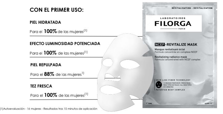 Mascarilla de tejido enriquecida con NCEF y ácido hialurónico para una piel visiblemente repulpada y luminosa en 15 minutos.
