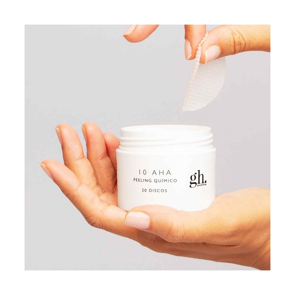 Peeling químico con una combinación equilibrada de alfahidroxiácidos (AHAs) al 10 %: ácido glicólico, ácido cítrico y ácido málico.