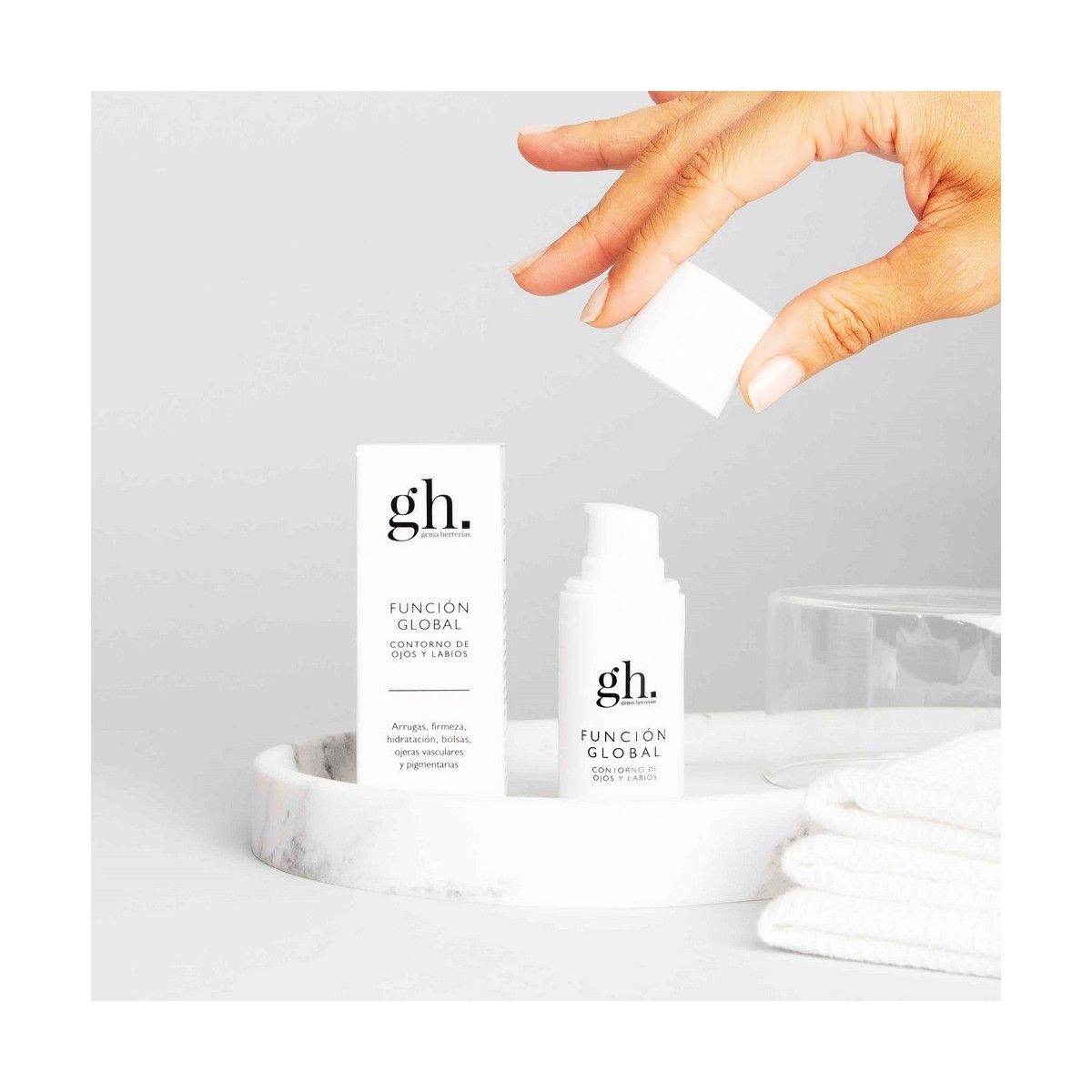 - Su función global es eficaz en tratamiento y prevención de todos los signos de envejecimiento. Mejora de arrugas de expresión, firmeza, hidratación, bolsas y ojeras oscuras tanto vasculares como pigmentarias.