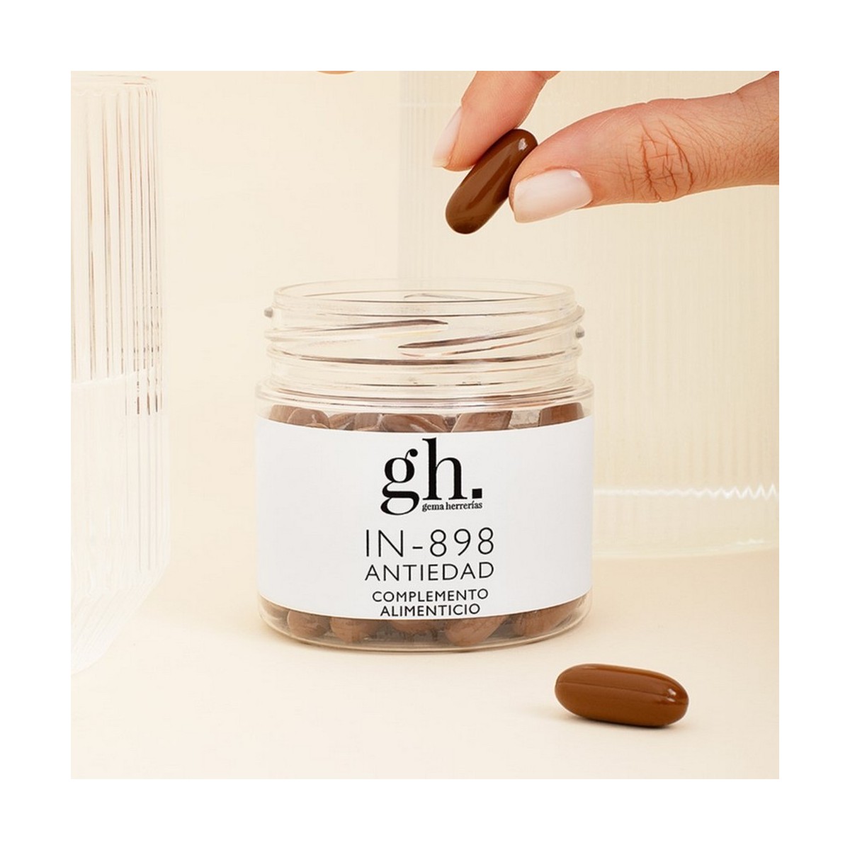 Complemento alimenticio elaborado a base de fitoceramidas (Ceramosides™), ácidos grasos omega 3, 6 y 9 obtenidos a partir de los aceites de onagra y linaza, ácido hialurónico, ashwagandha (KSM-66®), niacina (fuente de nicotinamida) y bisglicinato de magnesio quelado tamponado.