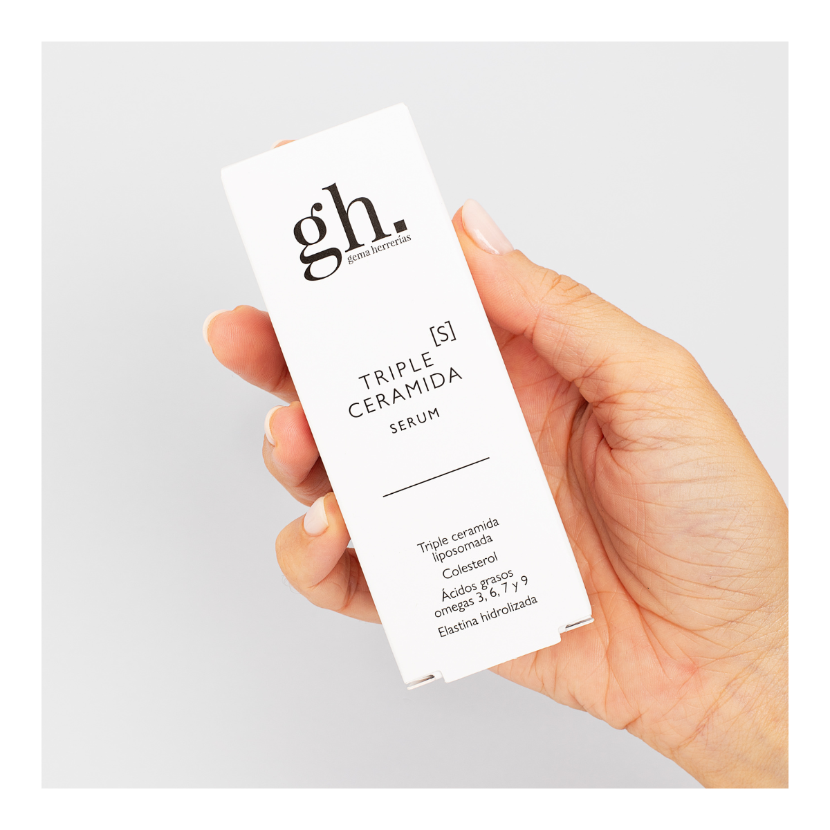 Sérum facial formulado con triple ceramida liposomada, ácidos grasos omegas 3, 6, 7 y 9, colesterol y elastina hidrolizada.