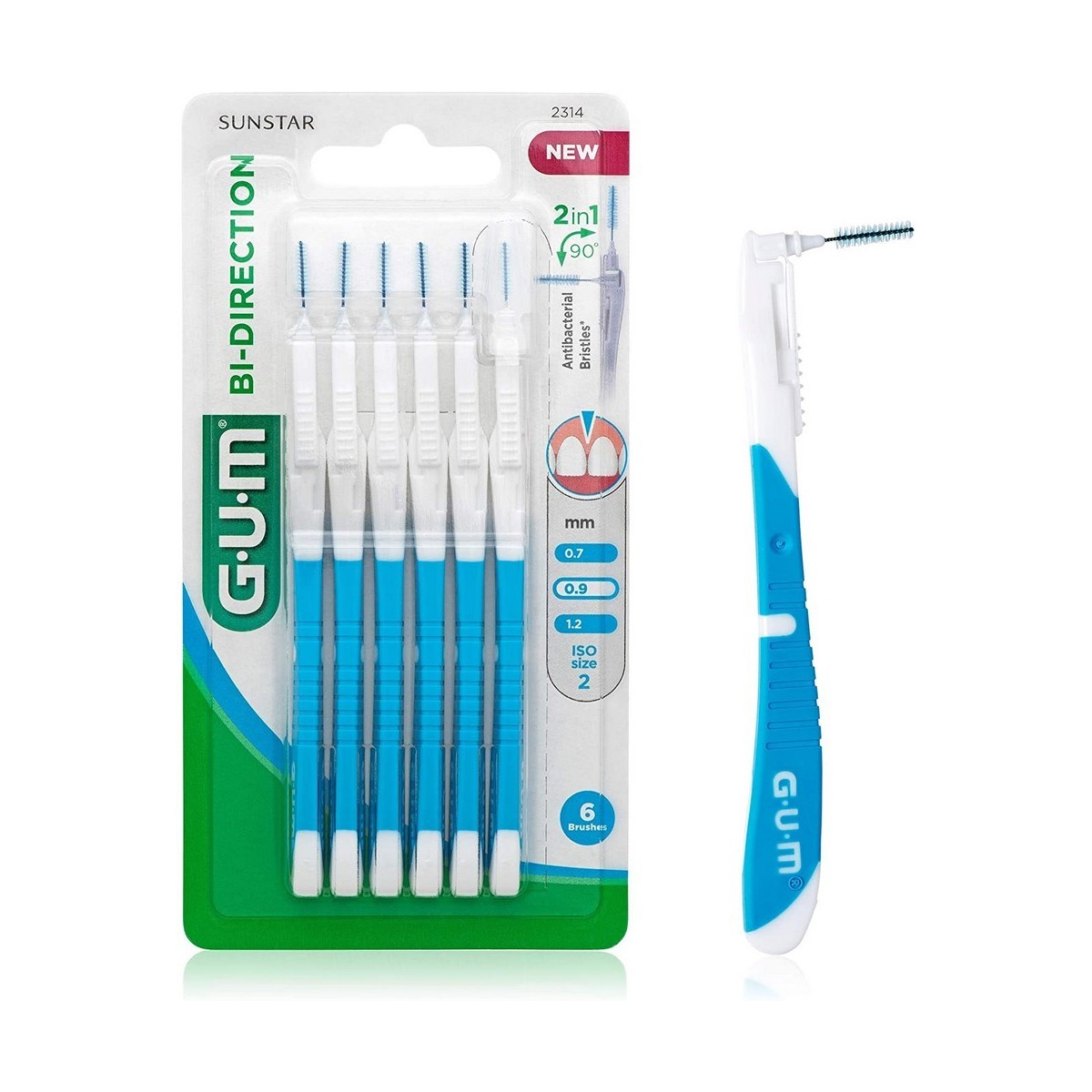 Los cepillos bidireccionales GUM, permiten la rotación de su cabezal 90º facilitando su uso. De esta manera permiten la correcta eliminación de la placa bacteriana y los restos de alimentos de aquellos espacios a los que el cepillo no puede llegar.