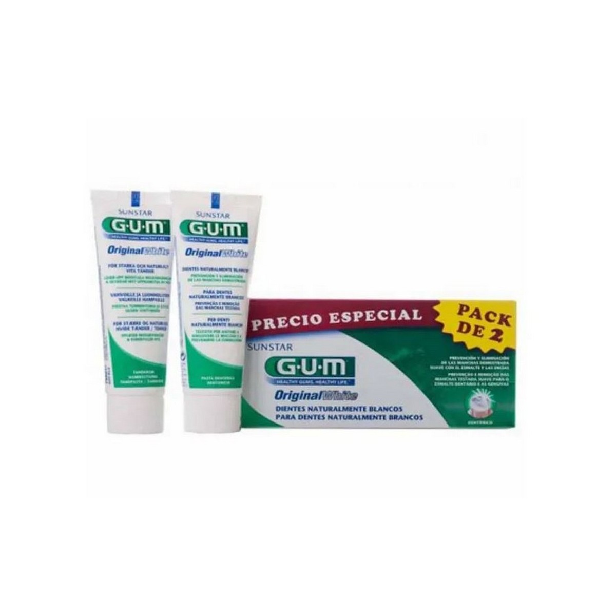 La pasta GUM ORIGINAL WHITE restaura el blanco natural de los dientes eliminando eficazmente las manchas y previniendo su reaparición.