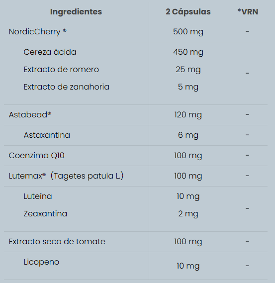 NordicCherry® (Prunus cerasus, fruto), cápsula* [agente de recubrimiento: hidroxipropilmetilcelulosa], extracto seco de Haematococcus pluvialis (microalga, 5% astaxantina), coenzima Q10 (98%), extracto seco de Tagetes erecta L. (flor, 10% luteína y 2% zeaxantina), extracto seco de fruto de tomate (Solanum lycopersicum, 10% licopeno), agente de carga (celulosa microcristalina), antiaglomerante (sales magnésicas de ácidos grasos), vitamina B2 (riboflavina).