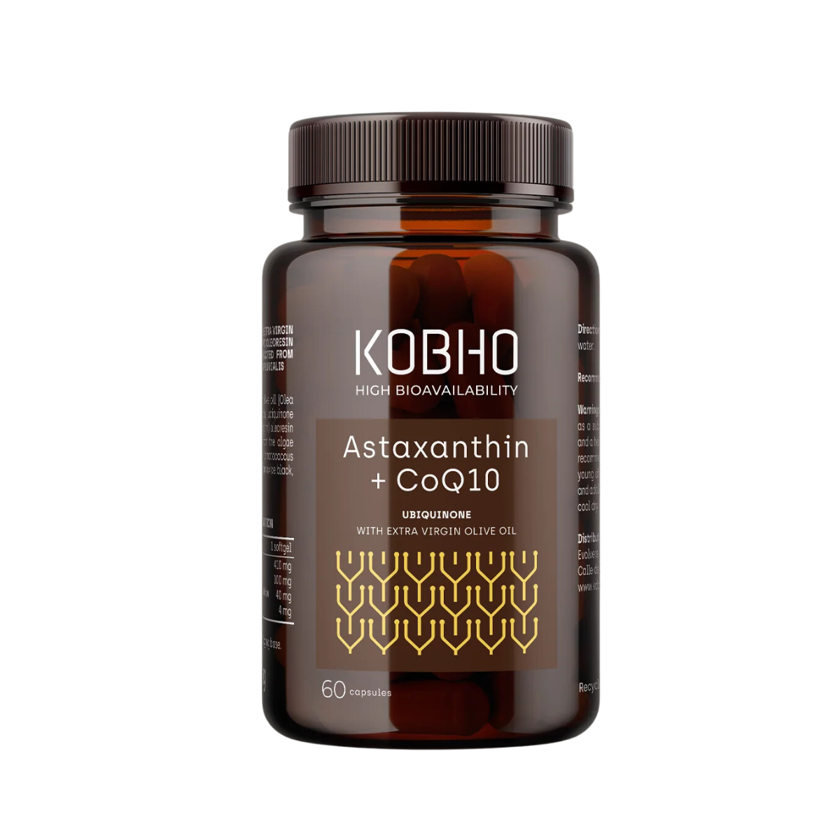 Aceite de oliva virgen extra (Olea europaea, fruto), gelatina bovina, ubiquinona (coenzima Q10), humectante (glicerina), oleeorresina rica en astaxantina extraída del alga Haematococcus pluvialis ( Haematococcus pluvialis, planta entera), color (óxido de hierro negro, óxido de hierro rojo), agua.