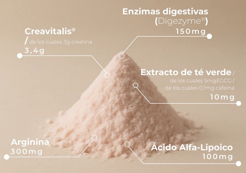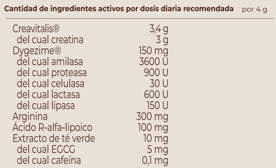 Creavitalis ® [monohidrato de creatina], L-arginina, complejo multienzimático [Dygezime ® (amilasa, proteasa, celulasa, lactasa, lipasa)], ácido R-alfa lipoico, espesante (goma arábiga), extracto de té verde (Camellia sinensis, hoja) 50% (–) 3-galato de epigalocatequina (EGCG).