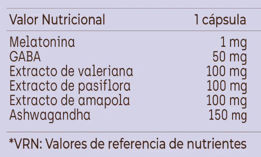 Ingredientes de la cápsula: extracto de ashwagandha (Withania somnifera, raíz, 5% withanólidos), extracto seco de valeriana (Valeriana officinalis, raíz, 0,2% ác. valerénicos), extracto seco de pasiflora (Passiflora incarnata L., partes aéreas, 3,5% vitexinas), extracto seco de amapola de california (Eschscholzia californica cham, partes aéreas, 0,2% protopina), ácido gamma-aminobutírico (GABA), melatonina.