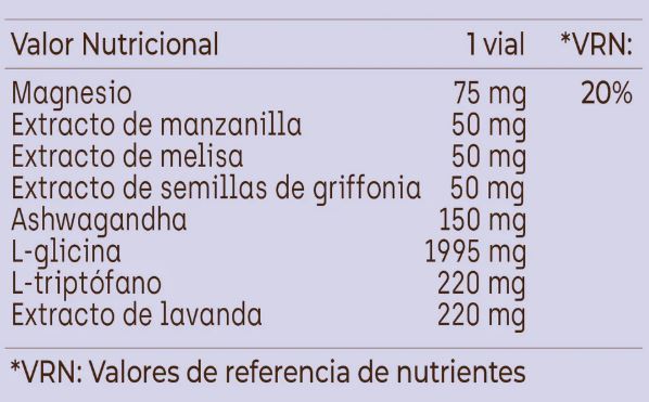 Ingredientes del vial: agua, L-glicina, bisglicinato de magnesio, corrector de acidez (ácido cítrico), L-triptófano, extracto de ashwagandha (Withania somnífera, raíz, 5% withanólidos), aroma, extracto fluido de manzanilla (Matricaria chamomilla, flores), extracto seco de melisa (Melissa officinalis, hoja, 2,5% ácido rosmarínico), extracto seco de griffonia (Griffonia simplicifolia, semillas, 20% 5-HTP), extracto seco de lavanda (Lavandula officinalis, 2% aceites esenciales), conservadores (sorbato potásico, benzoato sódico), espesante (goma guar).
