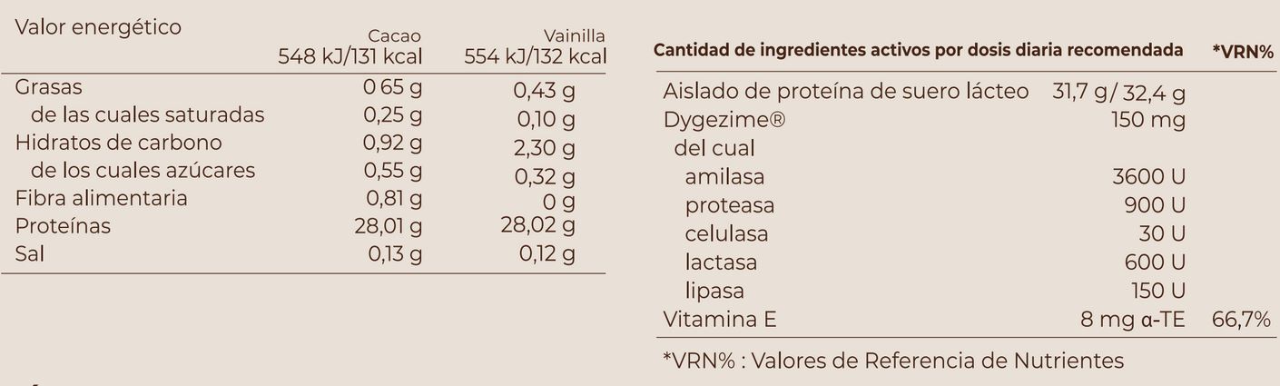 Aislado de proteína de suero lácteo (LECHE), cacao en polvo (Theobroma cacao), aroma natural de cacao, espesante (goma arábiga), complejo multienzimático [Dygezime® (amilasa, proteasa, celulasa, lactasa, lipasa)], sal, acetato de DL-alfa-tocoferilo (vitamina E).