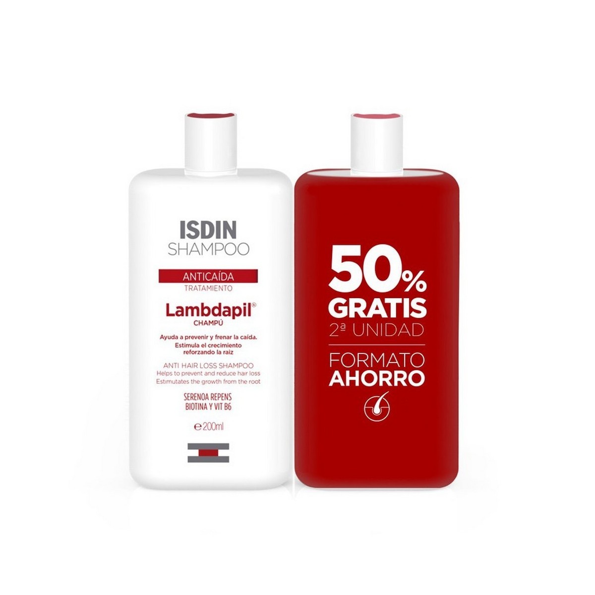 Lambdapil Duplo Champú Anticaída 2x200 ml contiene dos champús con una fórmula activa que frena la caída del cabello y estimula su crecimiento. Su principio activo se compone de extracto de Serenoa Rapens y un complejo multivactivo Trichogen, los cuales se encargan de regular las secreciones de las glándulas sebáceas y estimular la actividad de la raíz, devolviéndole fortaleza, salud y volumen al cabello.