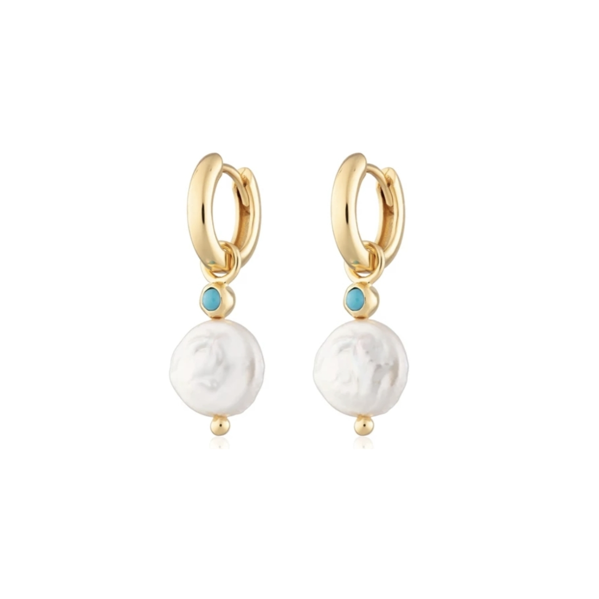 Aros plata de ley 925 bañada en oro de 18 k. con colgante de perla plana y turquesa.