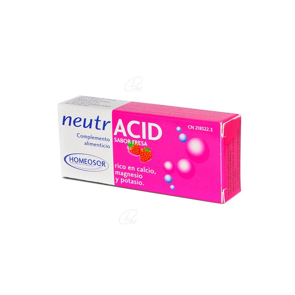 Carbonato cálcico, citrato potásico, hidróxido de magnesio, jugo de patata deshidratado, almidón de arroz, celulosa microcristalina, goma guar, estearato de magnesio, acesulfame potásico, aroma de fresa.