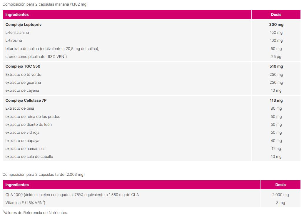 - La fórmula de tarde contiene CLA concentrado.