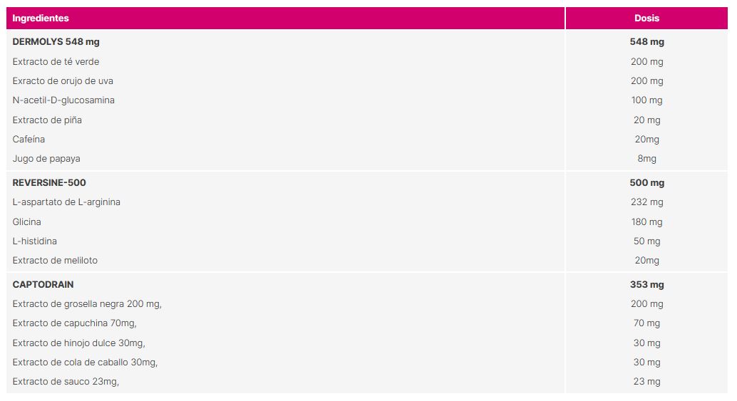 - Dermolys contiene extracto de orujo de uva para ayudar a reducir el aspecto de la celulitis, cafeína y extracto de té verde.