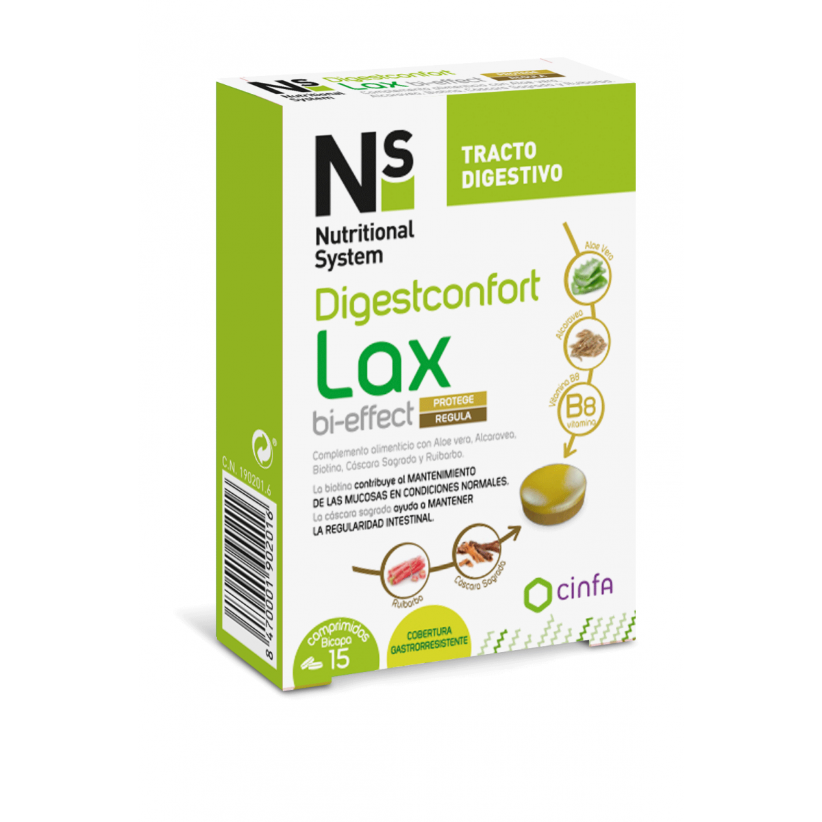 Ns Nutritional System ha desarrollado Ns Digestconfort Lax bi- effect, un complemento alimenticio a base de Aloe Vera, Alcaravea, Biotina, Cáscara sagrada y Ruibarbo. Ns Digestconfort Lax bi-effect es un comprimido bicapa con doble acción: una protectora de liberación rápida que ayuda a evitar la irritación de la mucosa del colon y otra reguladora que ayuda a mantener la regularidad intestinal.