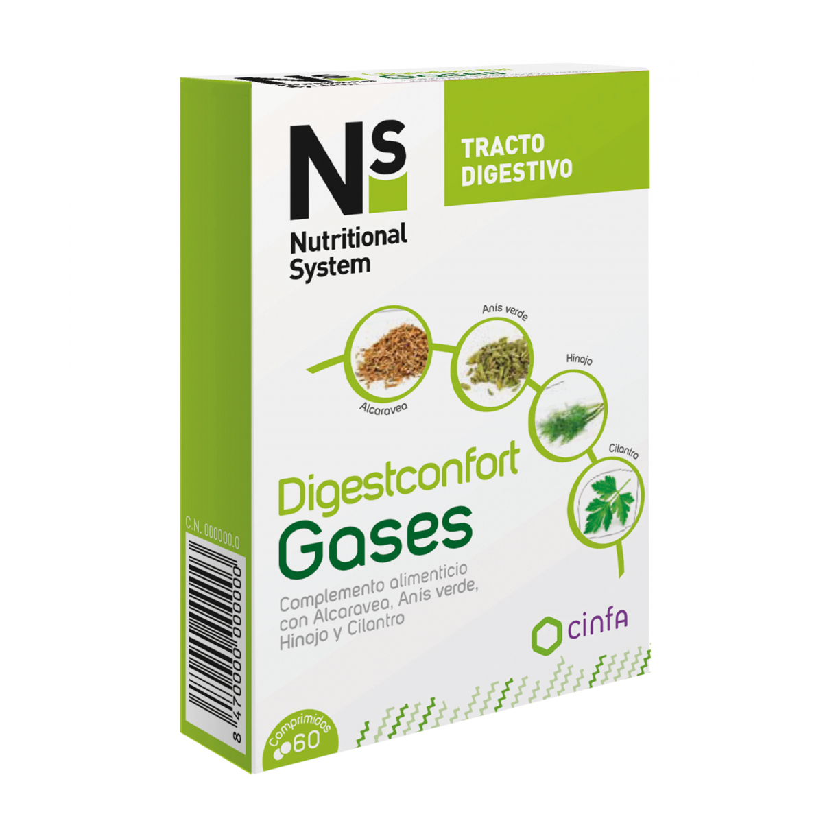 Ns Digesconfort gases esta formulado con aceites esenciales, los activos más eficaces en problemas digestivos, los cuales le proporcionan una doble acción: antiflatulento y antiespasmódico. Además es el único producto del mercado que presenta doble opción de toma, puede tomarlo en comprimidos o en infusión.