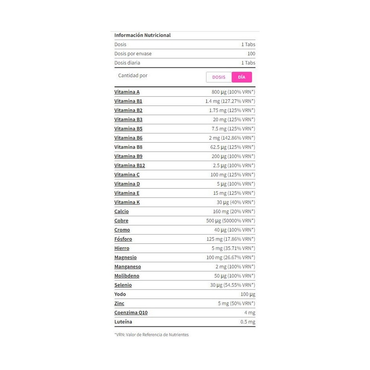 FOSFATO DE CALCIO, CELULOSA MICROCRISTALINA (AGENTE DE CARGA), ÓXIDO DE MAGNESIO, ÁCIDO L-ASCÓRBICO (VITAMINA C), HIDROXIPROPILMETIL CELULOSA (AGENTE DE CARGA), MALTODEXTRINA, ACETATO DE DL-ALFA TOCOFEROL (VITAMINA E), NICOTINAMIDA (VITAMINA B3), CITRATO DE ZINC, FUMARATO FERROSO, D-PANTOTENATO DE CALCIO (VITAMINA B5), ACETATO DE RETINOL (VITAMINA A), TALCO (ANTIAGLOMERANTE), DIÓXIDO DE TITANIO (COLORANTE), SULFATO DE MANGANESO, ÁCIDOS GRASOS DE PALMA (ANTIAGLOMERANTE), HIDROXIPROPIL CELULOSA (AGENTE DE CARGA), COENZIMA Q10, CLORHIDRATO DE PIRIDOXINA (VITAMINA B6), COLECALCIFEROL (VITAMINA D), ACEITE DE COCO, SULFATO DE COBRE, RIBOFLAVINA (VITAMINA B2), ÓXIDOS E HIDRÓXIDOS DE HIERRO (COLORANTE), MONONITRATO DE TIAMINA (VITAMINA B1), LUTEÍNA, ÁCIDO FÓLICO (VITAMINA B9), CLORURO DE CROMO, YODURO DE POTASIO, MOLIBDATO DE SODIO, D-BIOTINA (VITAMINA B8), SELENITO DE SODIO, FITOMENADIONA (VITAMINA K1), CIANOCOBALAMINA (VITAMINA B12).