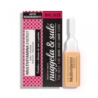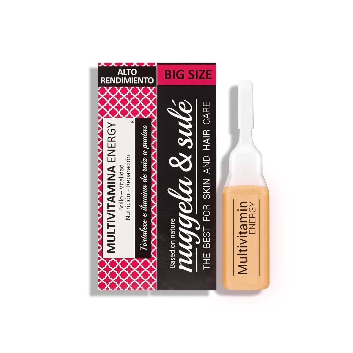 La ampolla Individual Multivitamina Energy de Nuggela & Sulé, es una formulación exclusiva que aporta vitaminas esenciales (E, C, B3, B5 y B6) para la salud del cabello a la vez que ofrece activos para revitalizar e iluminar el cabello como el Glucógeno Marino, Esencia de Caña de Azúcar y Cáscara de Limón.