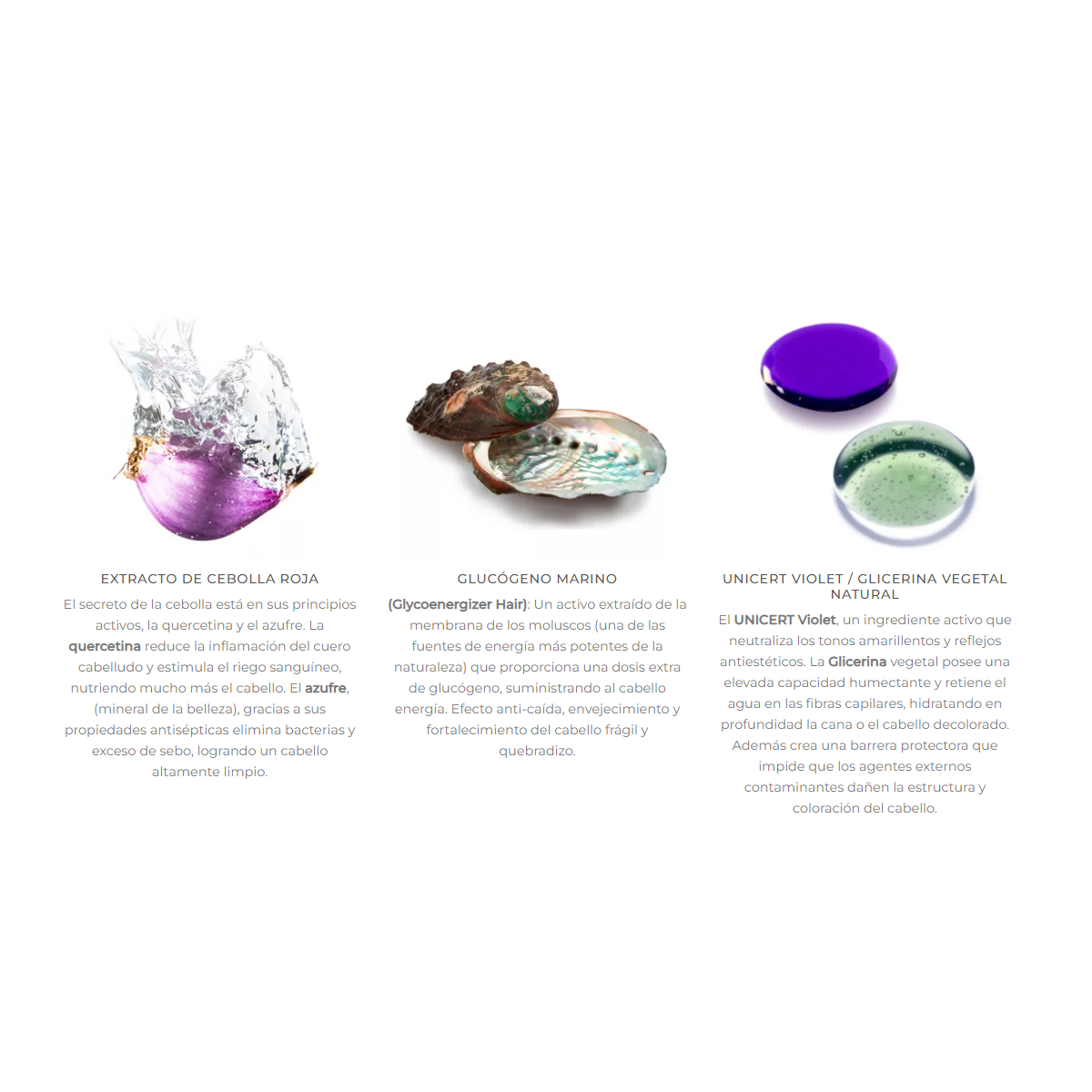 Con Extracto de Cebolla Roja, Glucógeno Marino, UNICERT Violet y Glicerina Vegetal Natural ingredientes activos que potencian la personalidad de la cana.