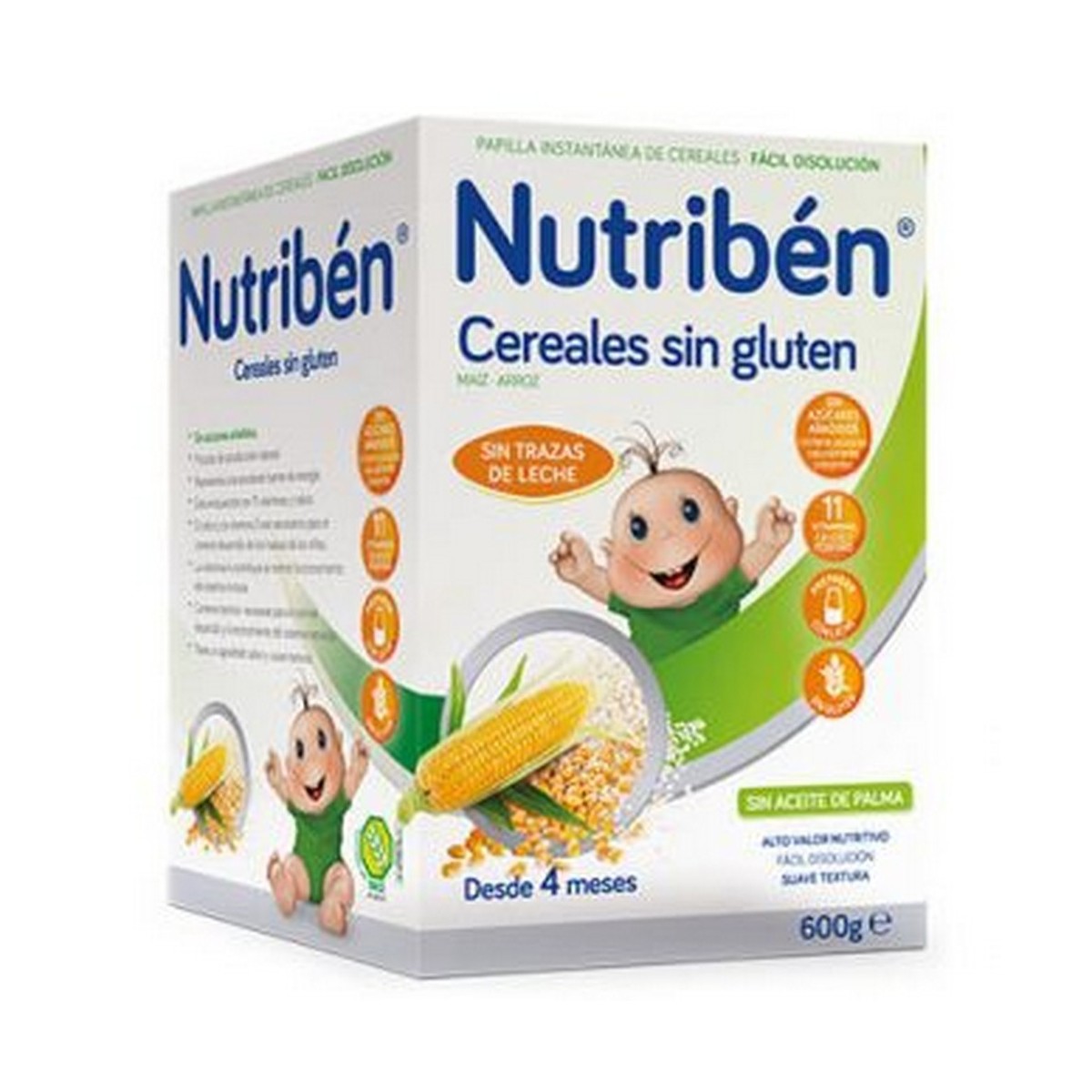 Cereales 99% (harina de arroz y maiz), maltodextrina de maiz y almidón de maiz, sales minerales (fosfato bicálcico), vitaminas (C, niacina, E, ácido pantoténico, B1, B6, A, ácido fólico, K1, biotina, D3) y aroma (vainillina).