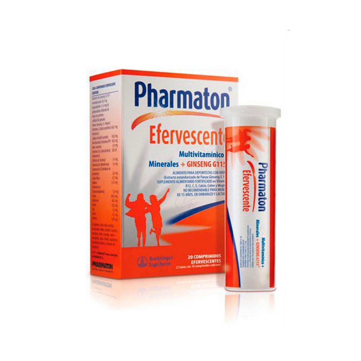 Correctores de acidez (ácido cítrico anhidro, hidrogenocarbonato de sodio), edulcorante (sorbitol), carbonato de calcio, edulcorante (sacarosa), óxido de magnesio, ácido ascórbico, extracto de ginseng G115, povidona, aroma de naranja, sulfato de hierro, concentrado de acetato alfa-tocoferol, trituración de betacaroteno, aroma de mandarina, aroma de limón, niacina, edulcorantes (aspartamo, acesulfamo de potasio), sulfato de cinc, hidrocloruro de piridoxina, concentrado de colecalciferol, riboflavina, nitrato de tiamina, sulfato de cobre anhidro, estearato de magnesio, trituración de cianocobalamina, ácido fólico, biotina, y selenito de sodio.