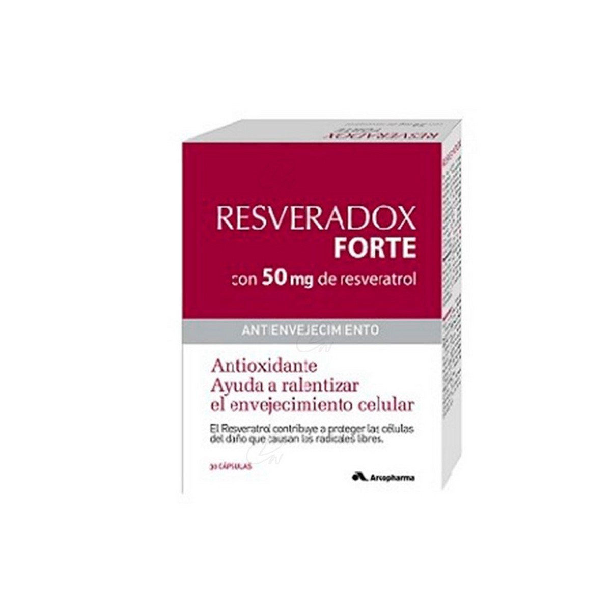 Extractos secos de uva (Vitis vinifera) (110 mg), extracto seco de raíz de Polygonum (100 mg) (Polygonum cuspidatum) rico en resveratrol (50 mg), agente de carga: fosfato de calcio, agente de carga: celulosa, antiaglomerantes: mono y diglicéridos de ácidos grasos, estearato de magnesio; óxido de zinc (10 mg), selenito de sodio (55 mcg) (maltodextrina).