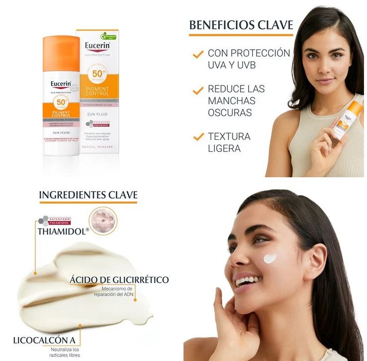 - Eucerin Pigment Control SPF50+ 50ml: protector solar facial avanzado con un amplio espectro de fotoprotección y con Thiamidol® despigmentante en su composición.