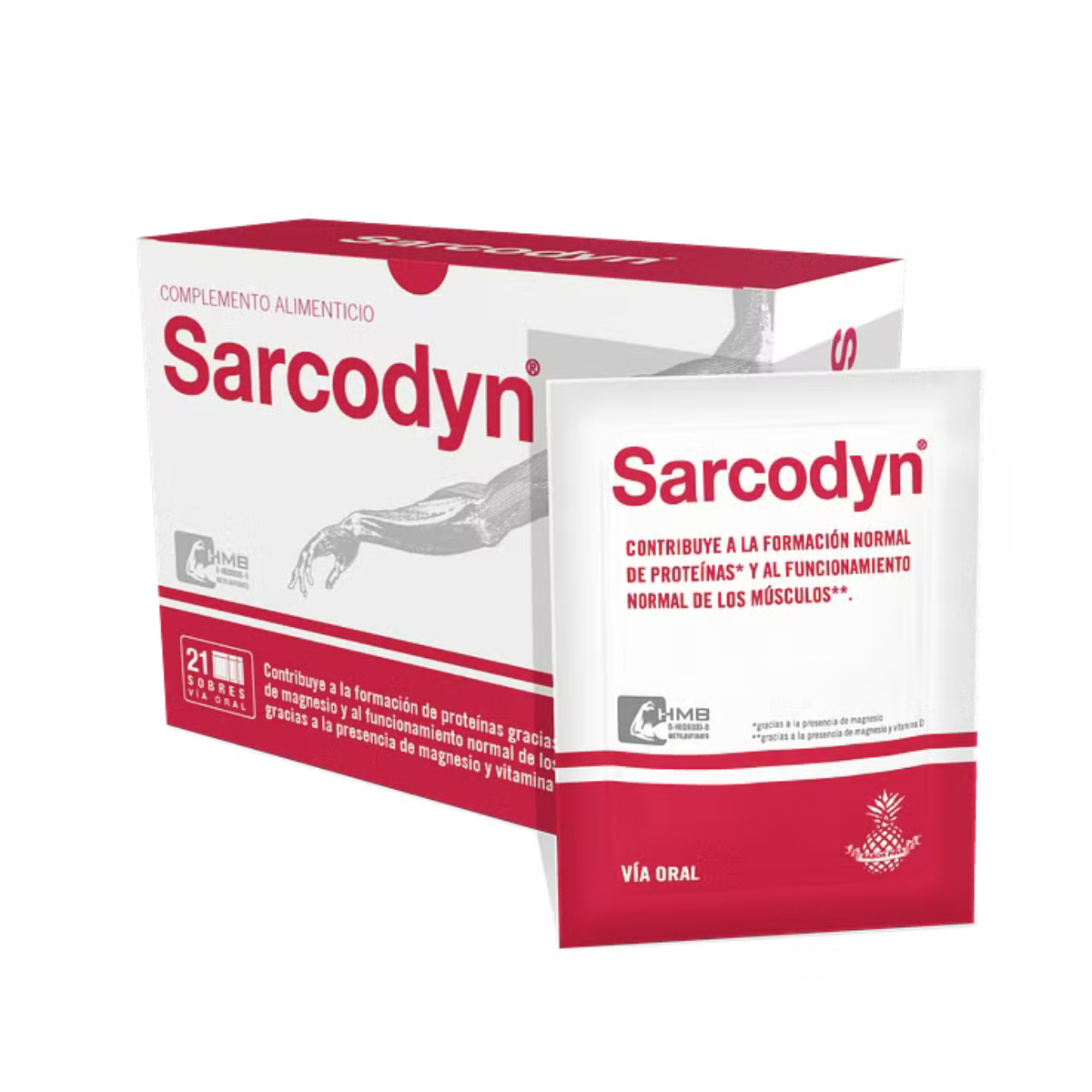 Sarcodyn piña es un complemento alimenticio formulado a base deCa-HMB (ß-hidroxi-ß-metilbutirato de calcio) aumenta el crecimiento del músculo esquelético, disminuye la degradación proteíca y activa la síntesis de proteínas.