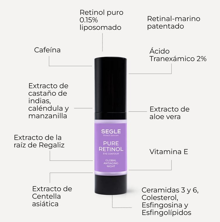- CONTORNO PURE RETINOL 15ML: contorno de ojos y labios de noche con retinol puro al 0.15% + el primer retinal de origen marino que combaten de forma eficaz todos los signos del envejecimiento.