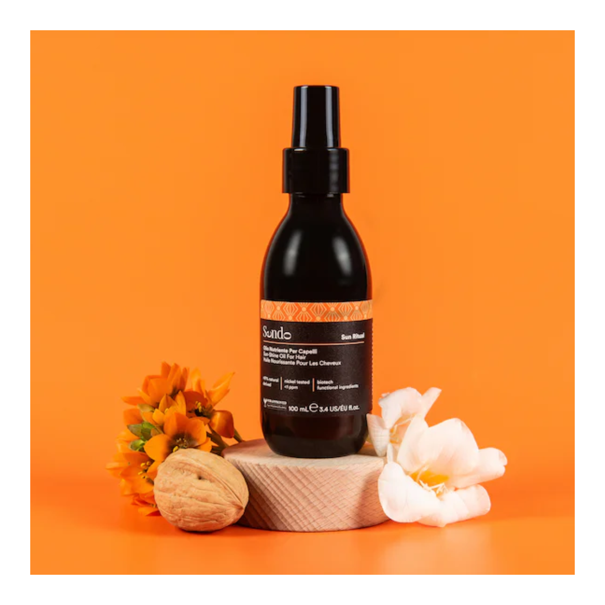 Aceite Nutritivo Para El Cabello diseñado y formulado por el Laboratorio de Investigación y Desarrollo de Sendo para nutrir e hidratar intensamente el cabello expuesto al sol, la sal y el cloro. Su textura ligera está enriquecida con aceite de granada bio, que revitaliza el cabello y aporta un brillo extremo.
