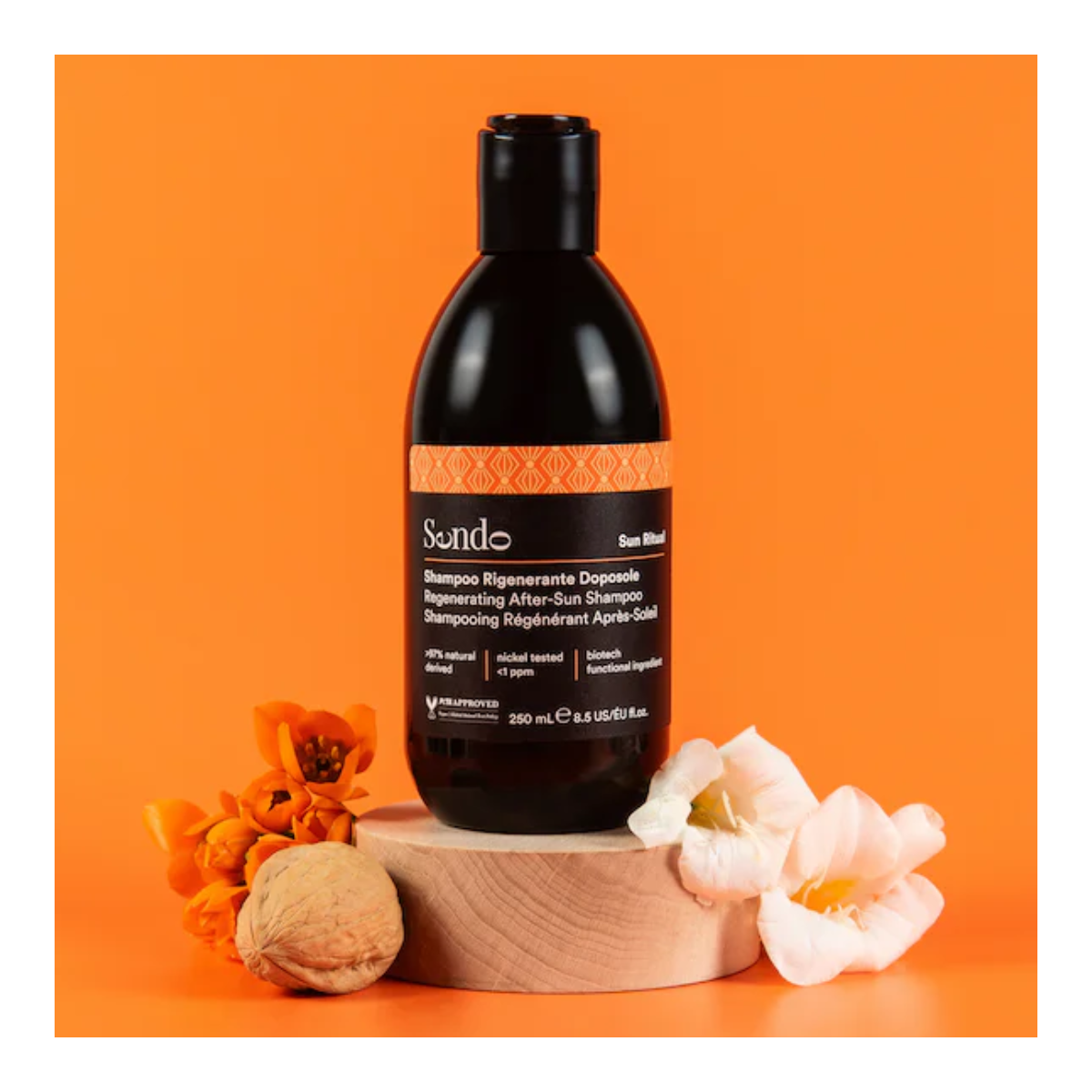 Descubre la delicadeza del Champú Regenerador para después del sol de la línea Sun Ritual, formulado para la limpieza diaria de los cabellos expuestos al sol, la sal u el cloro con extracto biotecnológico de tomate, aceite de monoi y extracto orgánico de cereza, que ayudan a nutrir el cabello tras la acción deshidratante del sol.