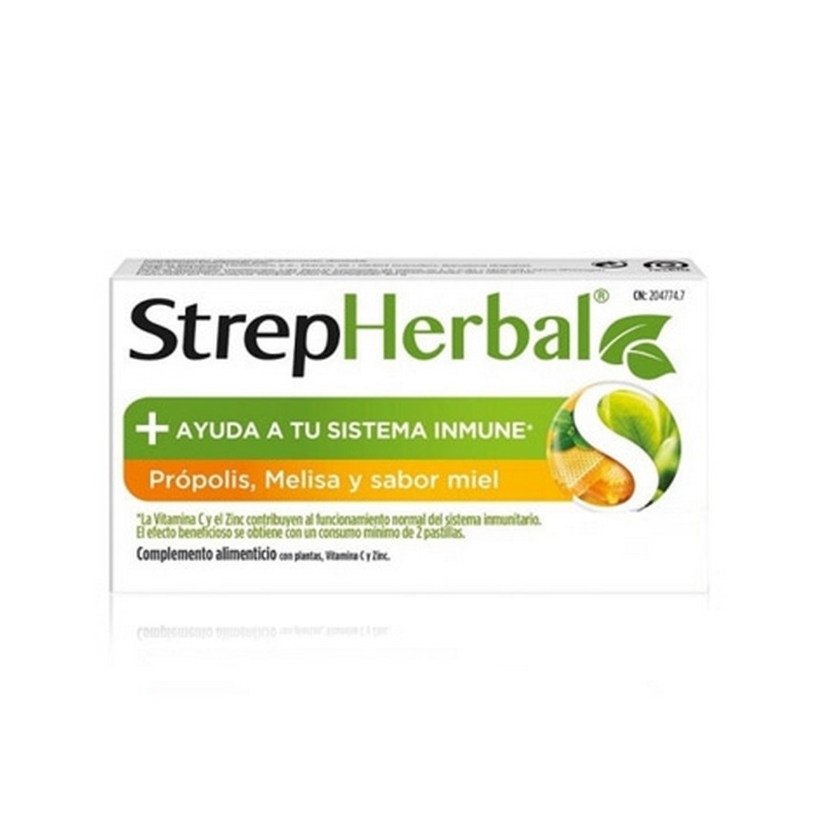 Incrementador de volumen (Isomalt), vitamina C (Ácido L-ascórbico) 40 mg, saborizante de miel, aromas (aceite de espino amarillo (Hippophae rhamnoides L., fruto)), (concentrado de zanahoria negra (Daucus carota L.,raíz)), extracto de propóleo en polvo, aroma de naranja, sulafato de zinc (1,15 mg Zinc), aroma de mentol, aceite de Melisa (Melissa officinalis L., hojas) 2,5 mg, edulcorante (glucósidos de esteviol-E960), colorante (Curcumina-E100) 0,38 mg.